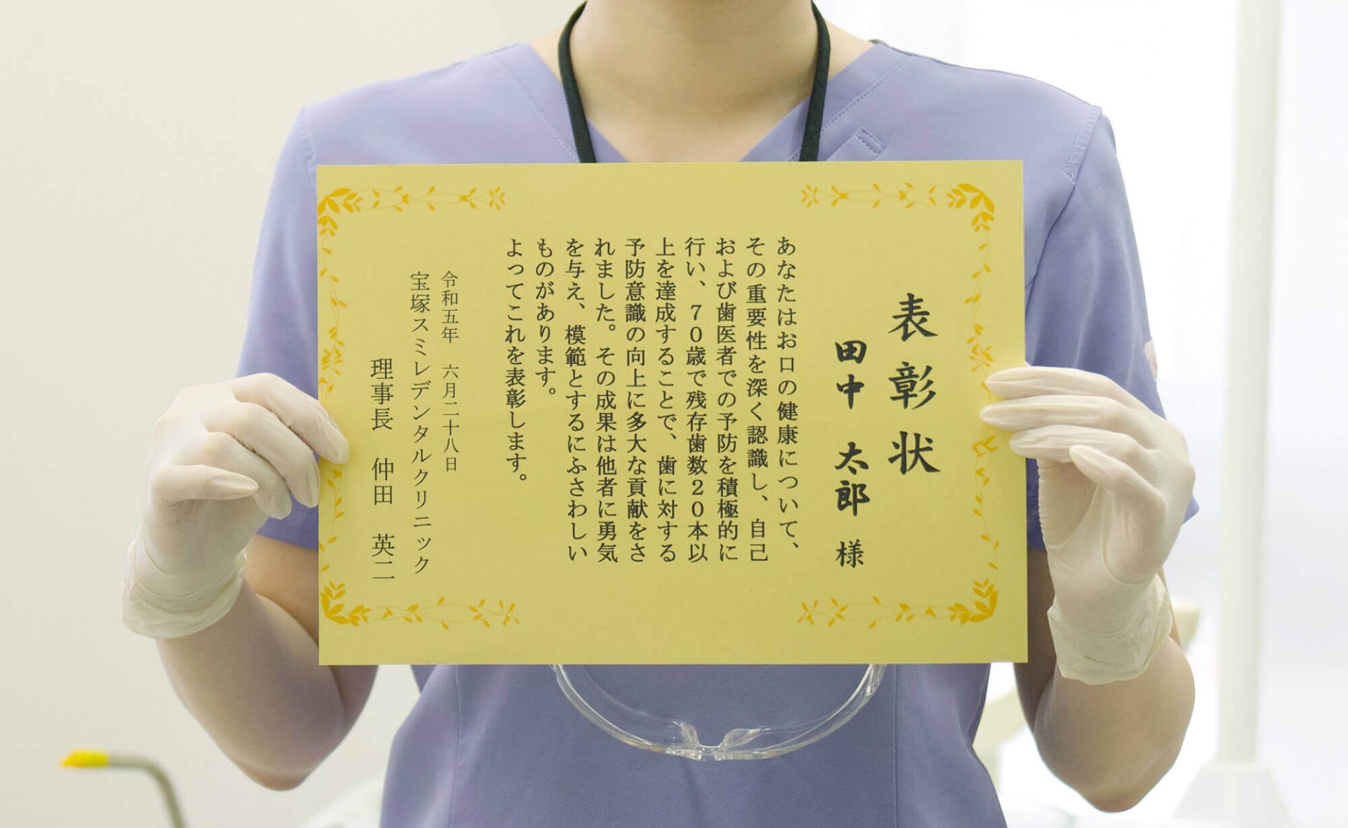 歳を重ねる毎に歯の大切さを感じていた折、この様な表彰状をいただき、とても嬉しく思っております。おいしく物が食べられることは、元気で長生きする事に繋がっていくことだと思います。これから先も先生のお力をお借りしながら一本でも多く維持できる様、頑張って行きたいと思います。