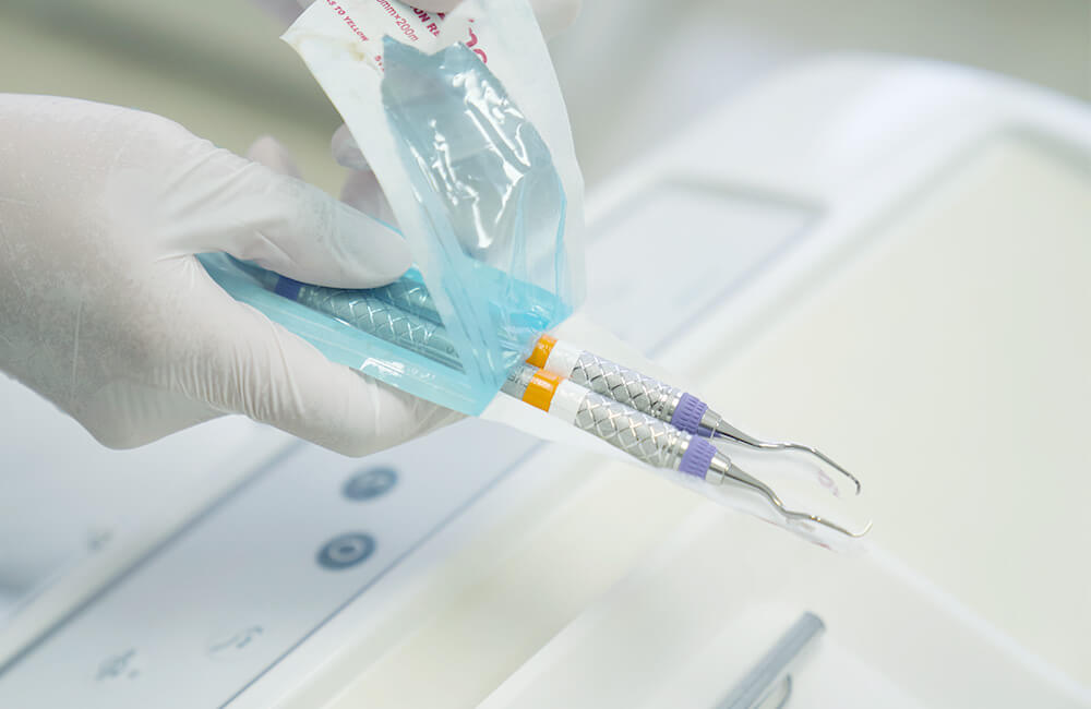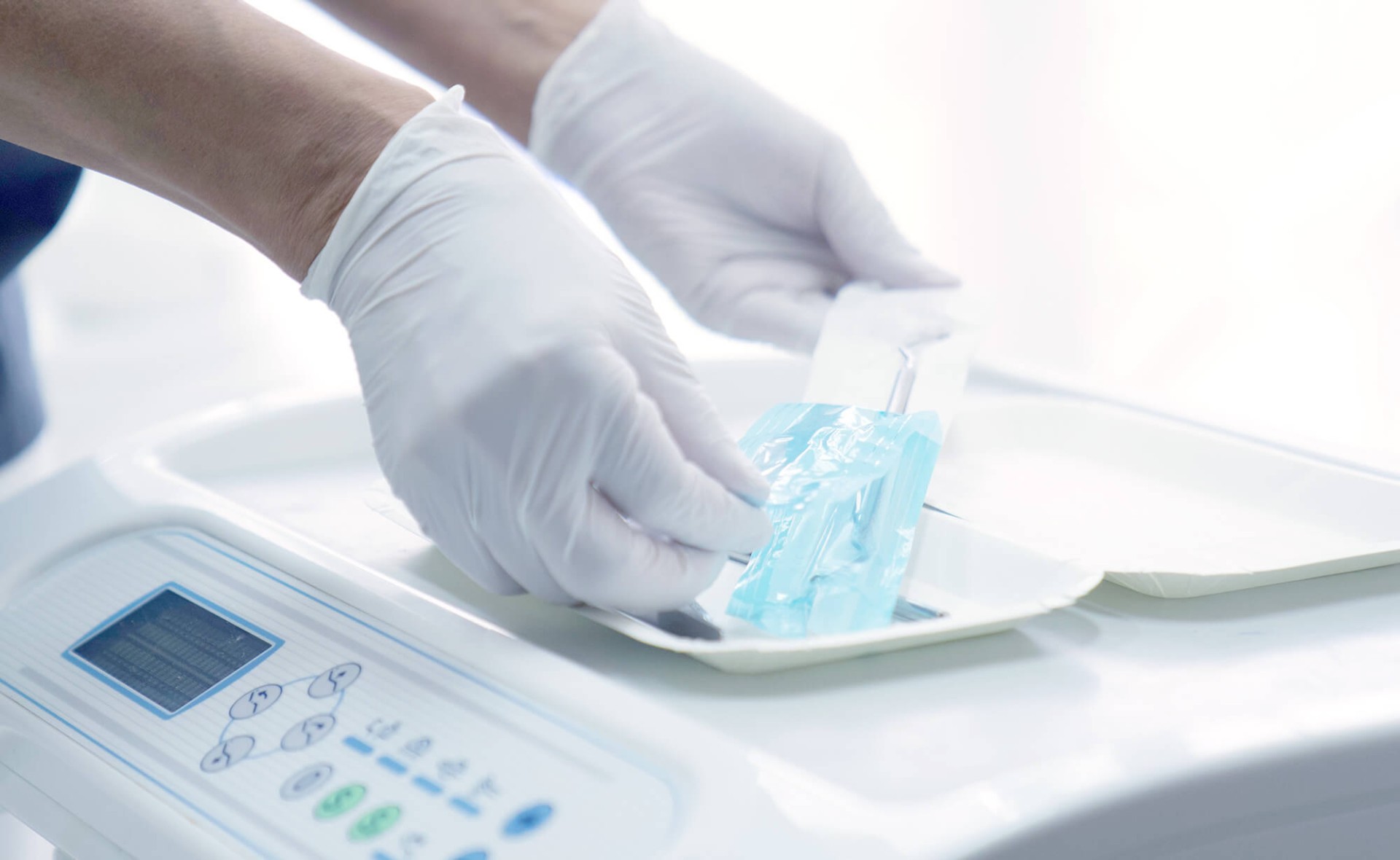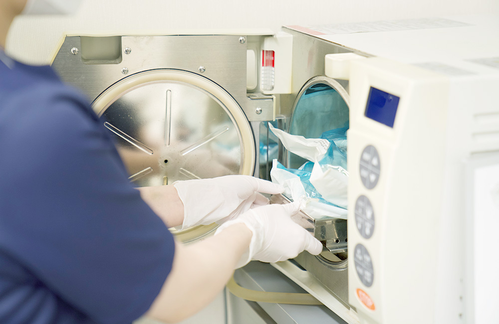 ゴム手袋、患者さま用のコップ・エプロン等は、使い捨てのものを使用し、使い捨ての出来ない医療器具などは、随時滅菌を行っています。
